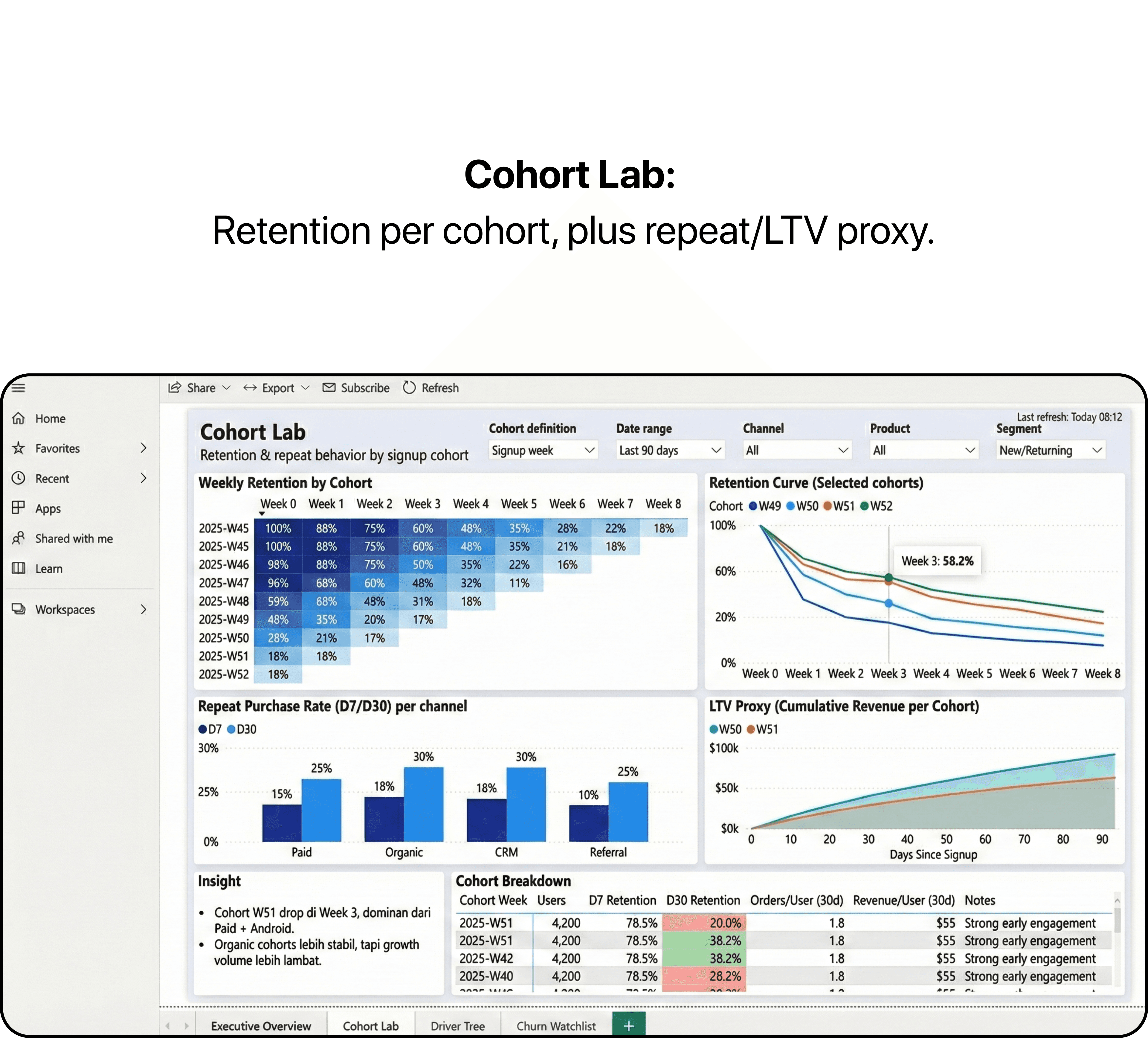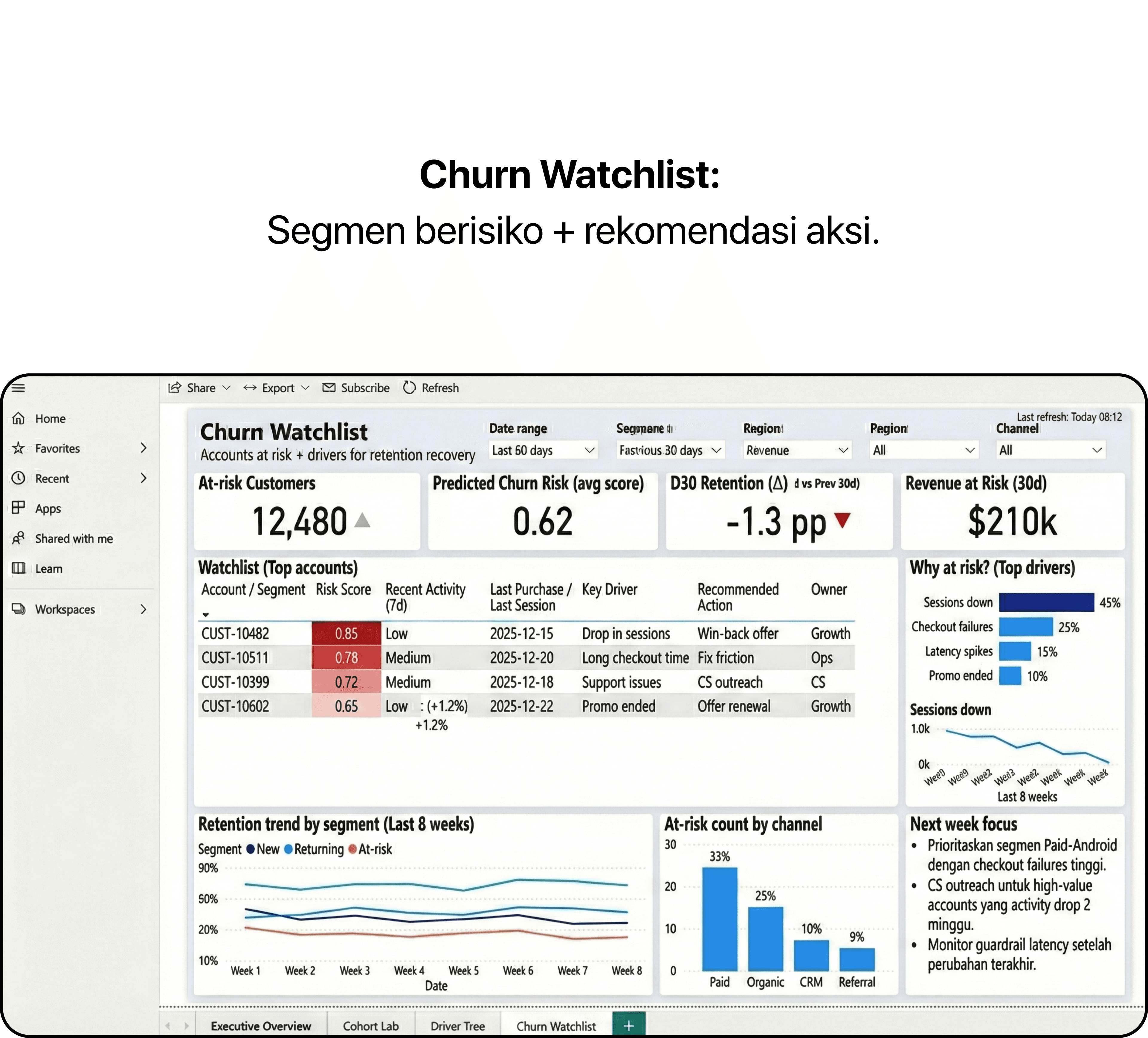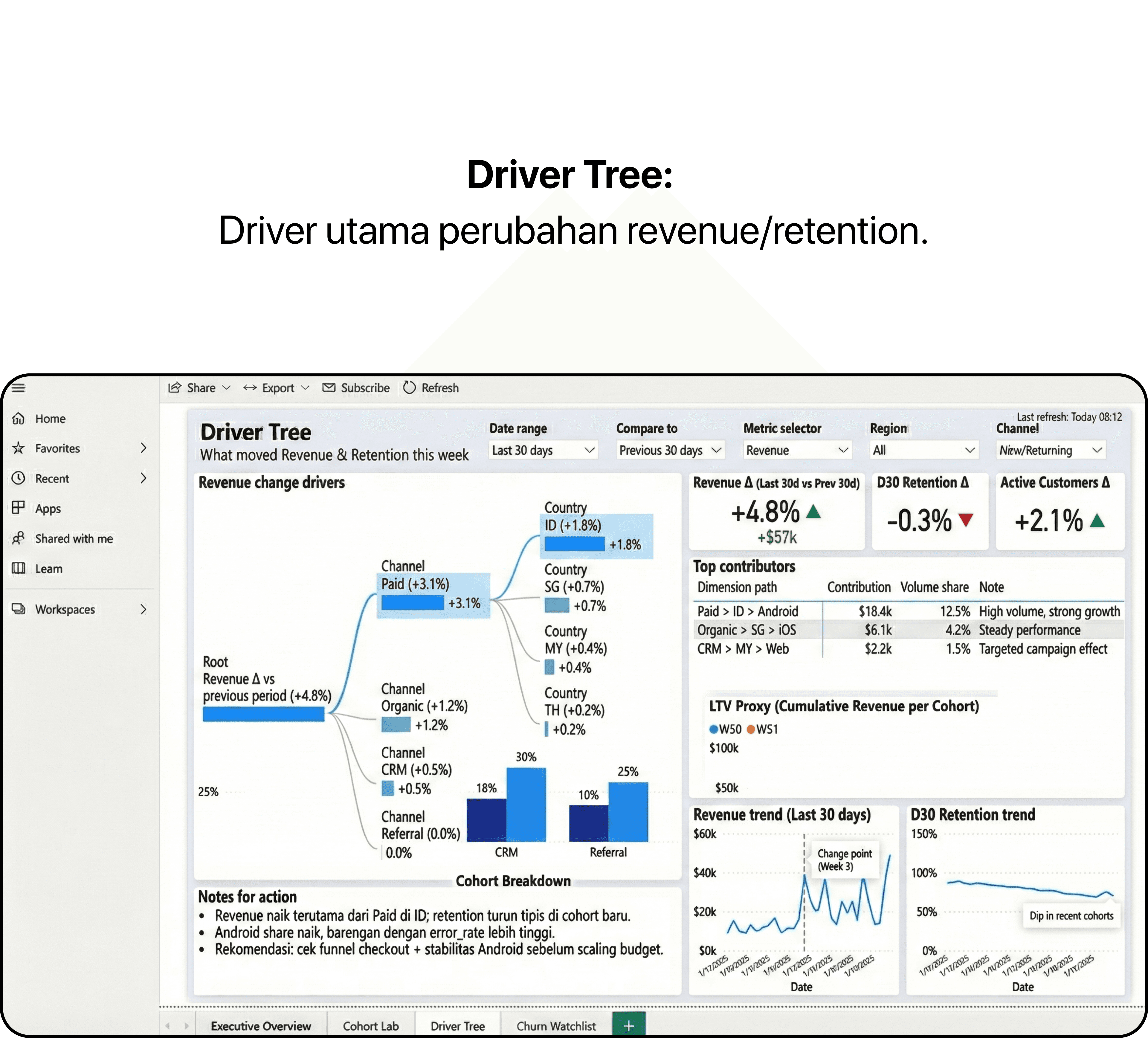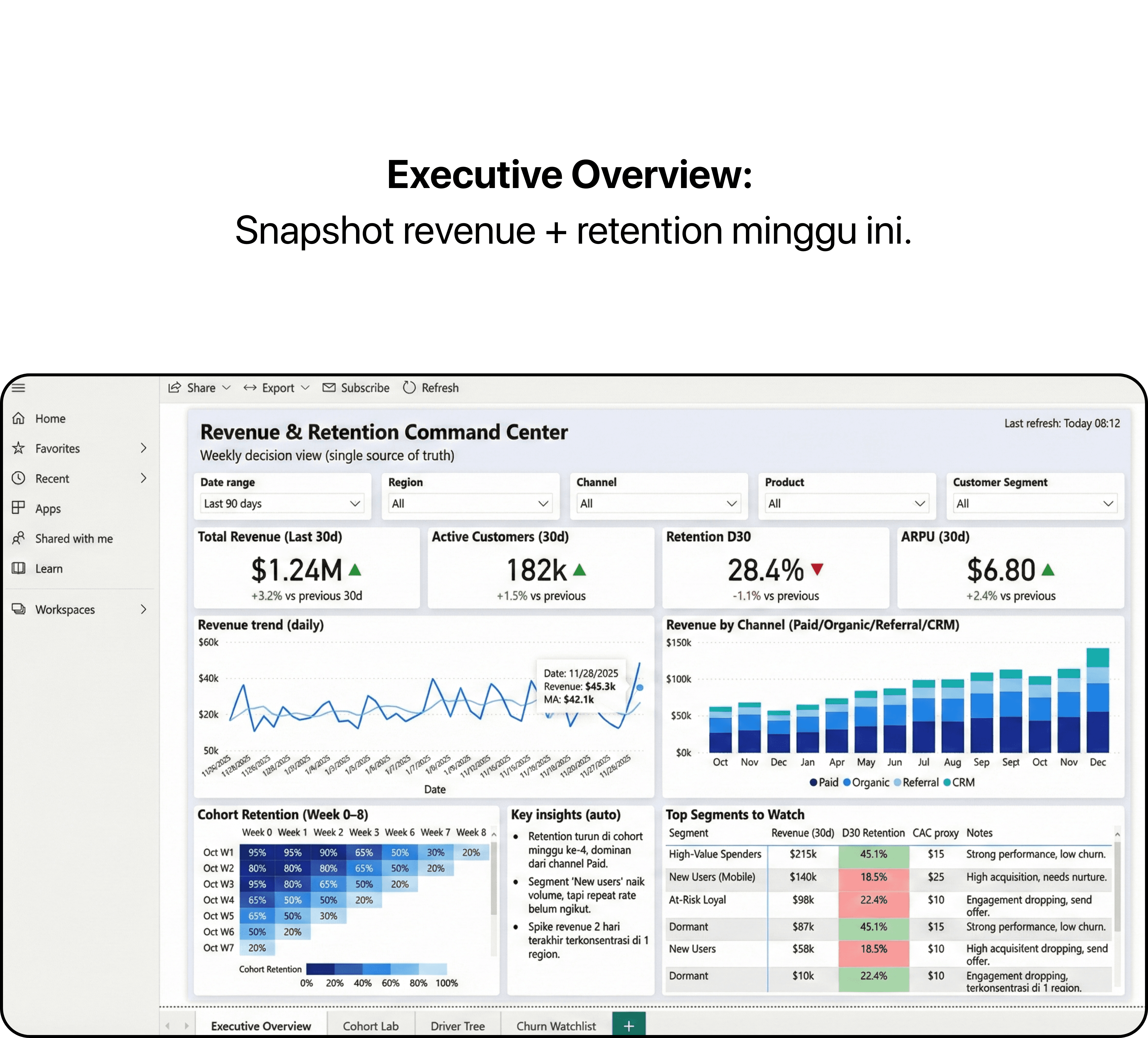 Dashboard Power BI end-to-end buat ngelock KPI revenue/retention, baca trend, bongkar driver perubahan (decomposition tree), dan prioritasi churn recovery lewat watchlist yang actionable.