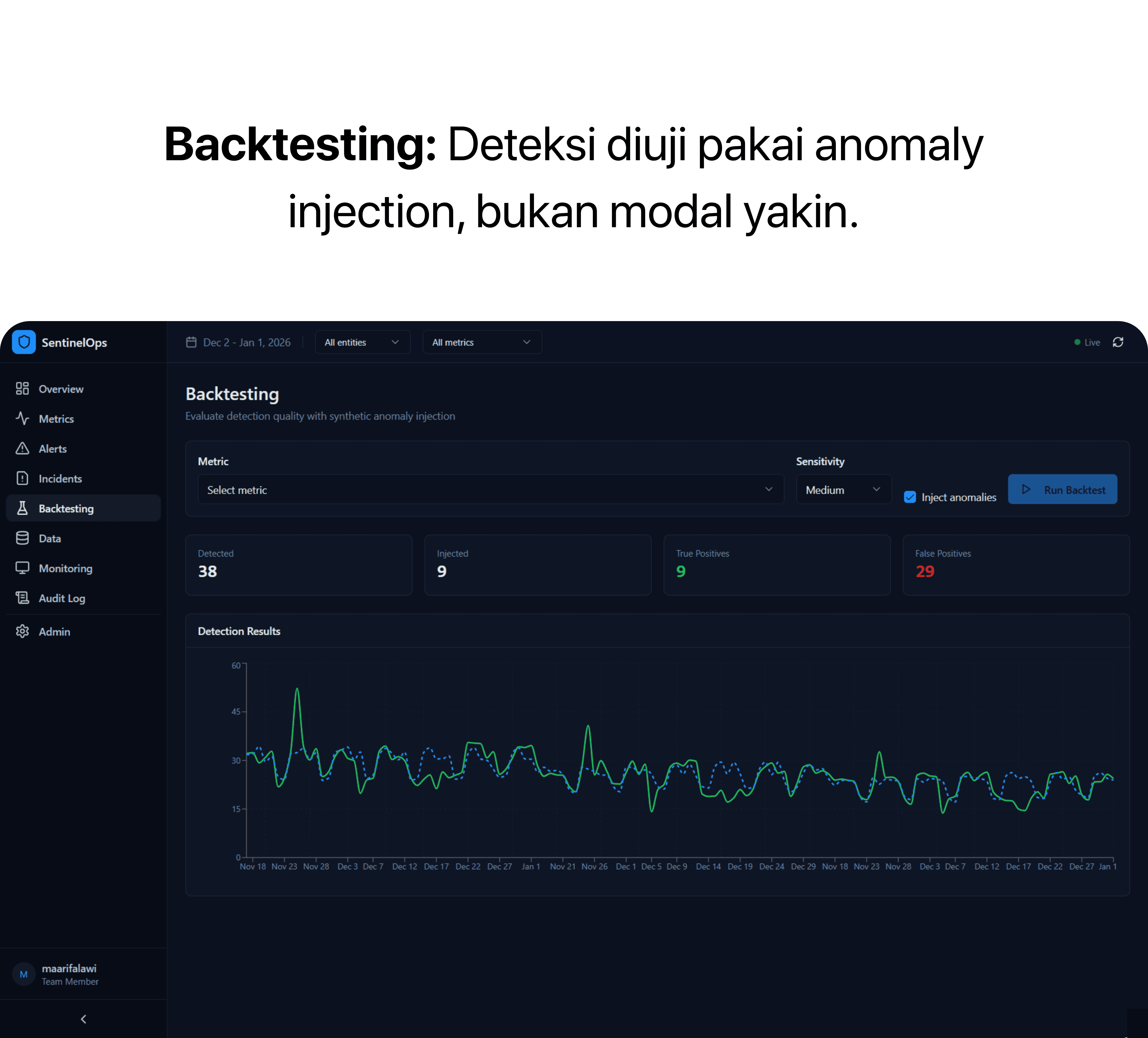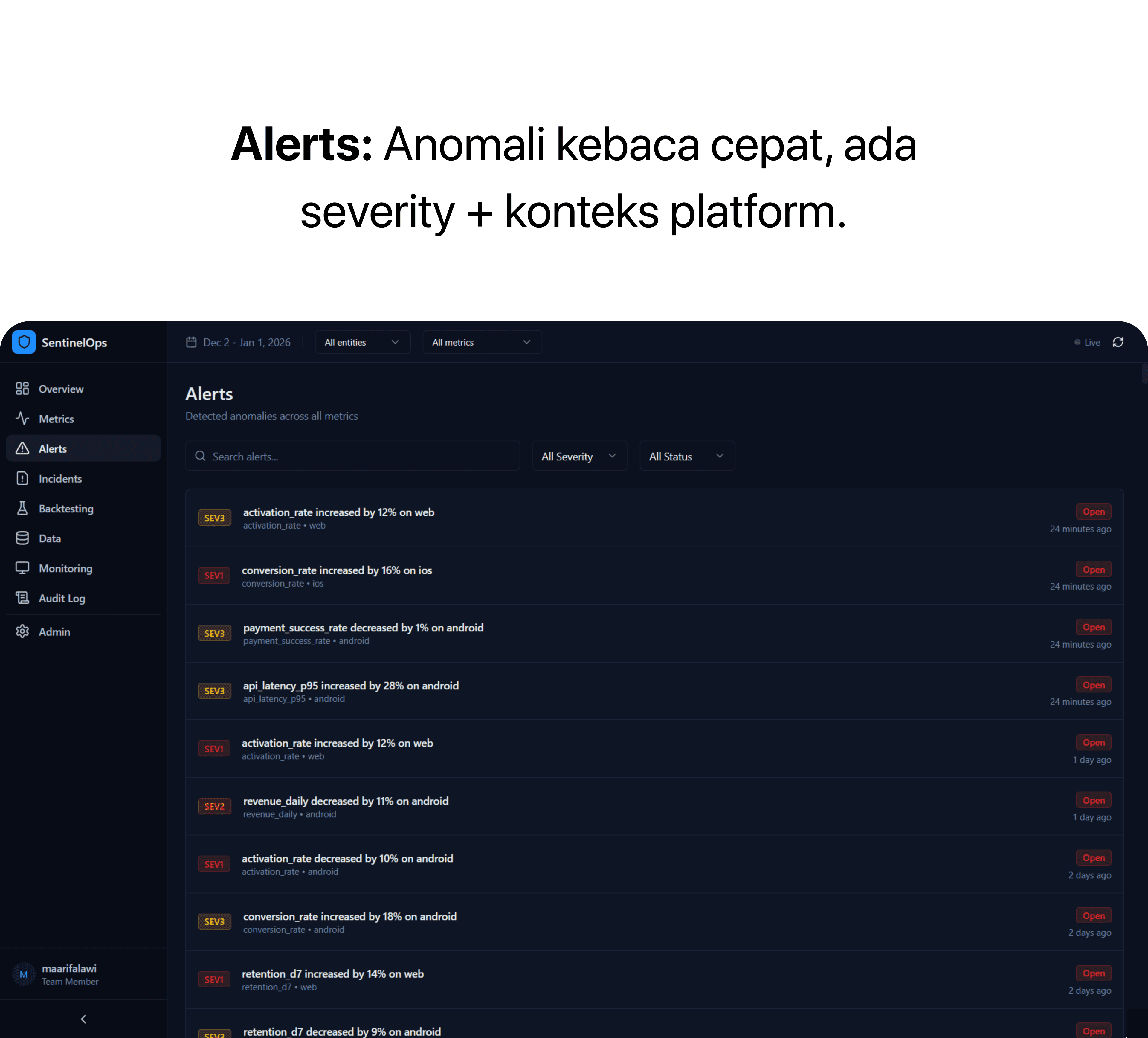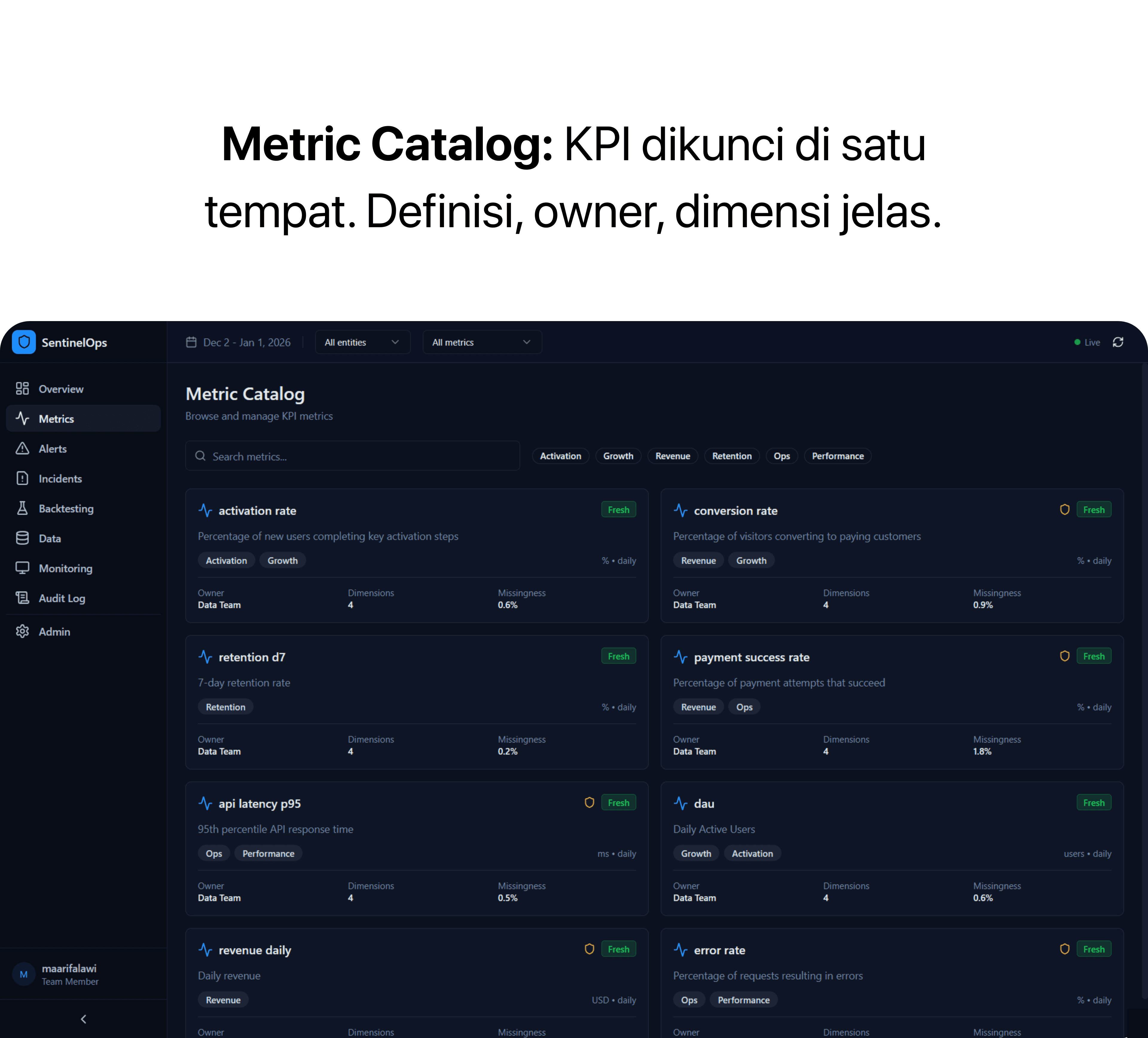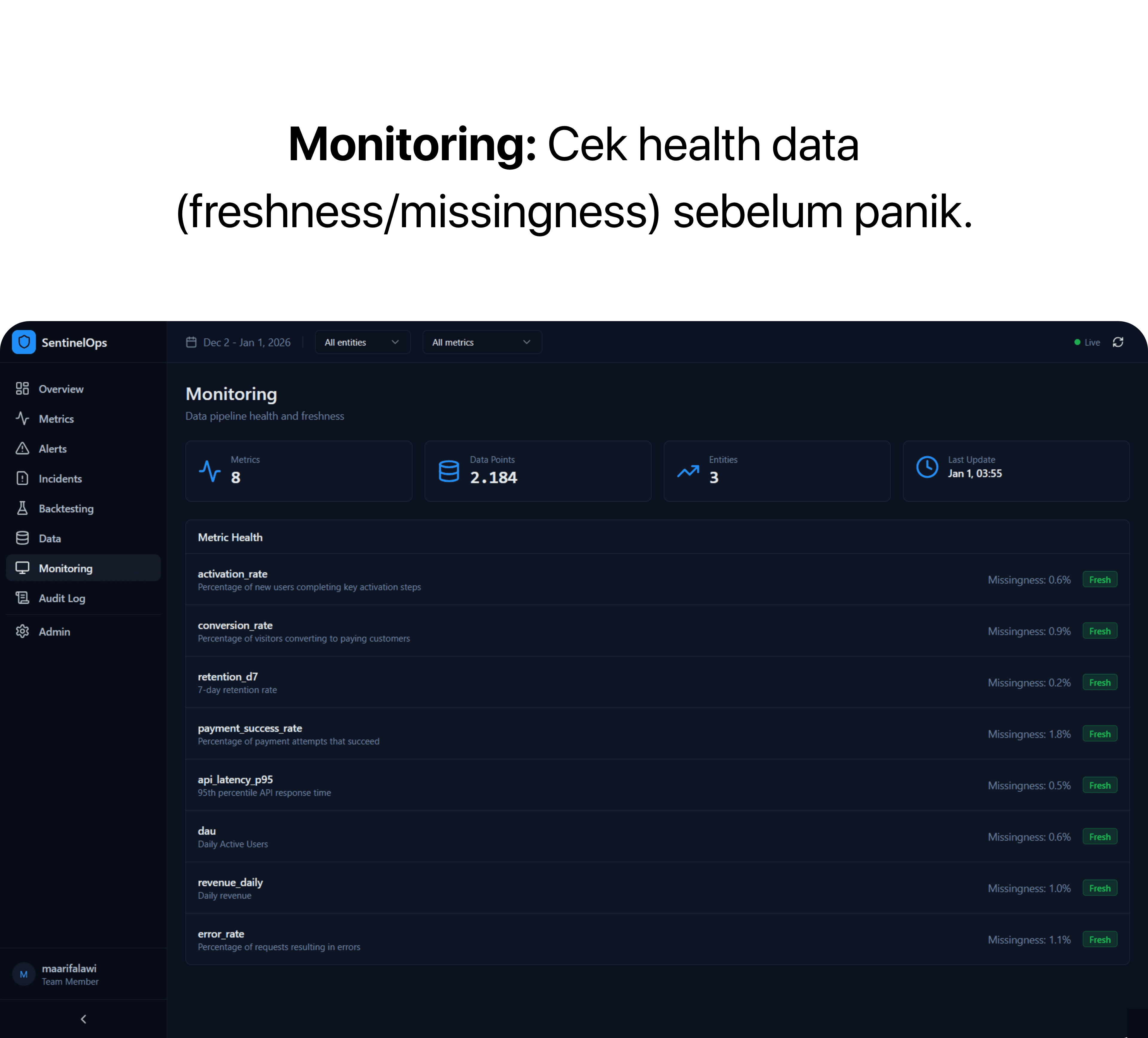 Gue bikin sistem yang ngubah dashboard KPI jadi “on-call workflow”: KPI dikunci definisinya, dimonitor health-nya, dan otomatis ngasih alert pas ada anomali. Jadi tim gak nunggu meeting buat sadar ada yang rusak, dan investigasi mulai dari sinyal yang udah diprioritasin. Bonusnya: detection-nya gue tes pake backtesting biar gak asal sensitif dan bikin noise.